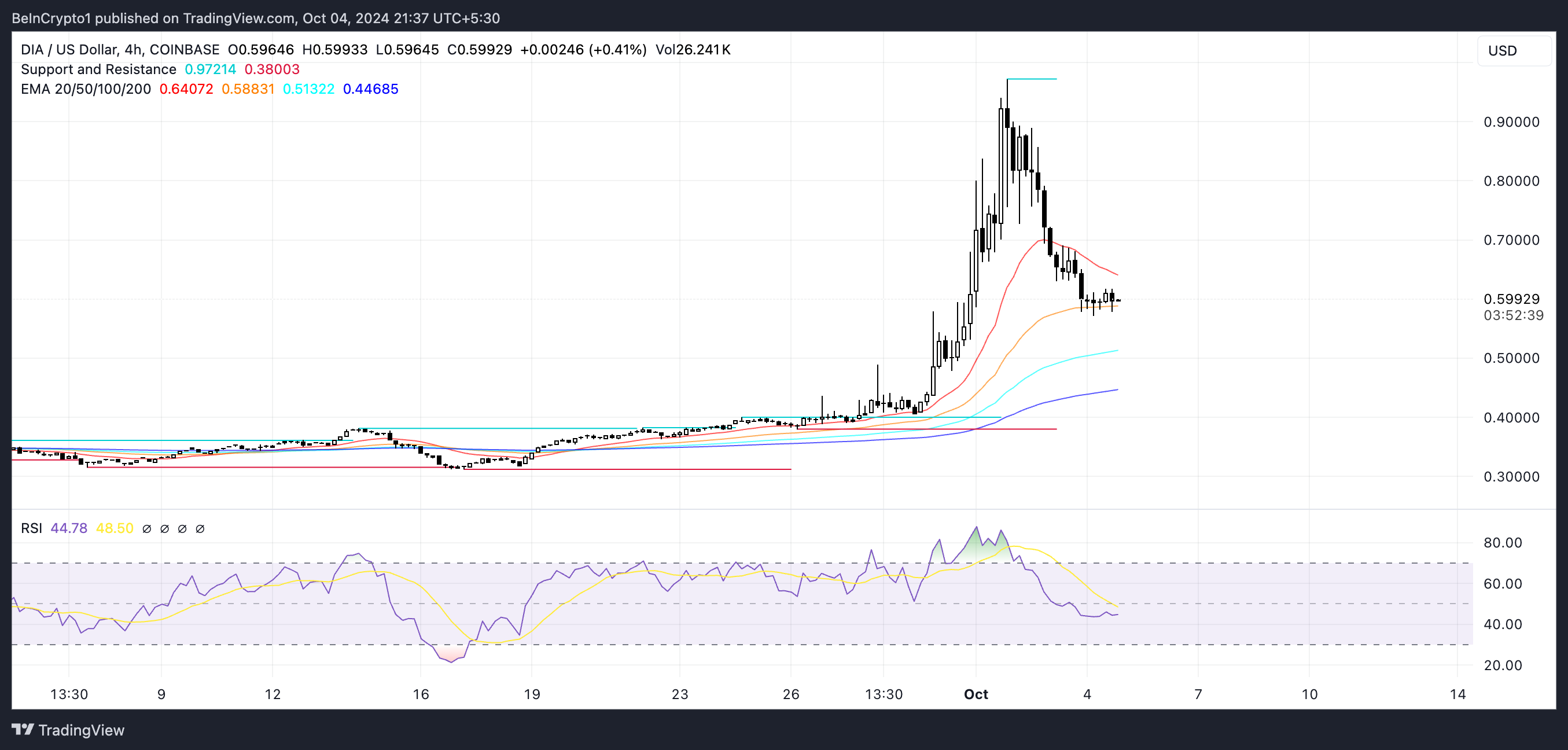 Bu geri çekilmeye rağmen, DIA’nın Üstel Hareketli Ortalamaları (EMA) hala boğa piyasasını işaret ediyor. Kısa vadeli EMAlar, uzun vadeli olanların üzerinde kalmaya devam ediyor. Bu da boğa eğiliminin hala devam ettiğini, ancak önceki zirveye kıyasla zayıfladığını gösteriyor.