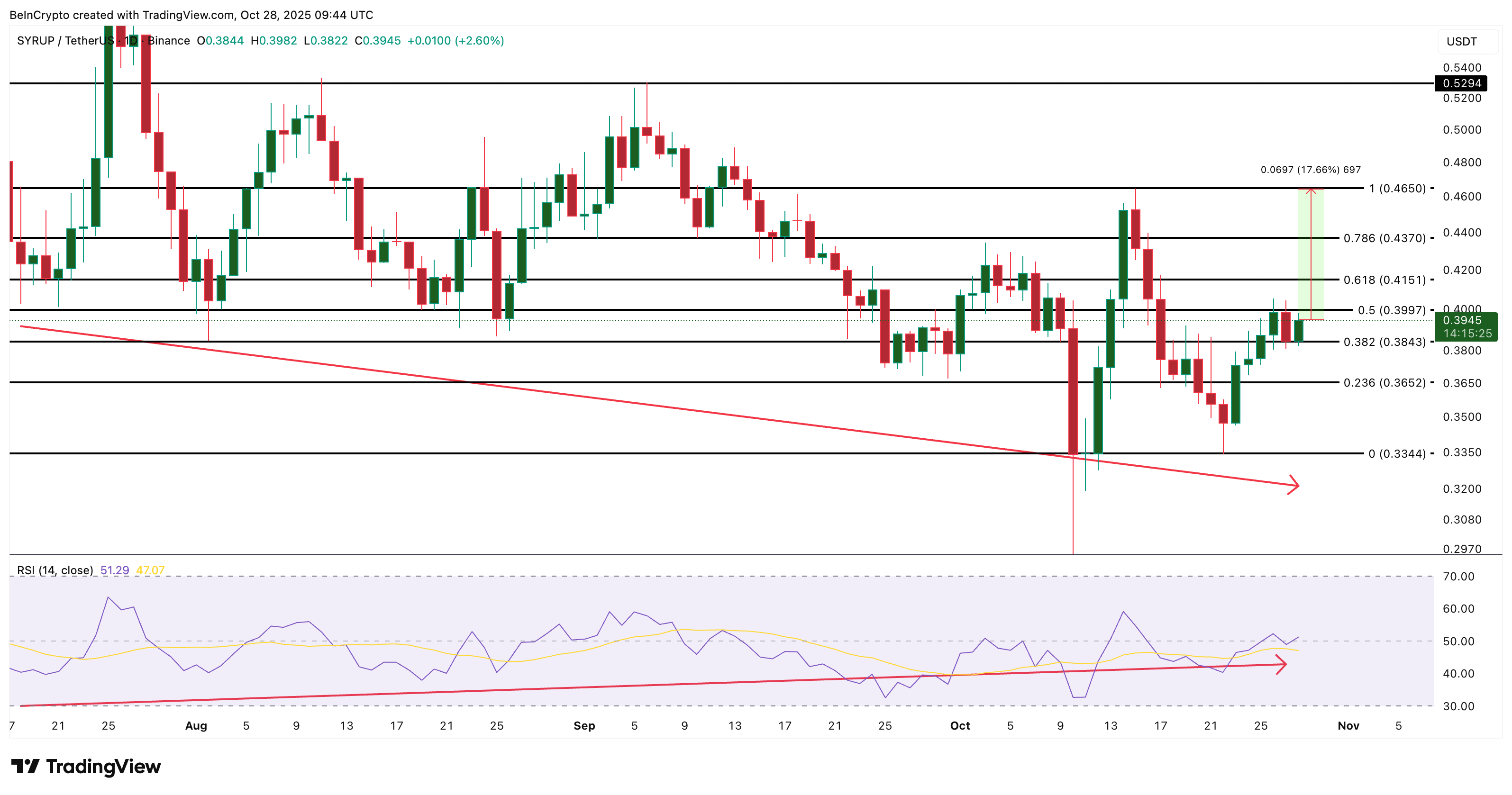 Grafiklerde, kurulum umut verici görünüyor. 18 Temmuz ile 27 Ekim arasında, SYRUP’un fiyatı daha düşük bir dip yaparken, Göreceli Güç Endeksi (RSI) — alım ve satım gücünü ölçen bir araç — daha yüksek bir dip yaptı.