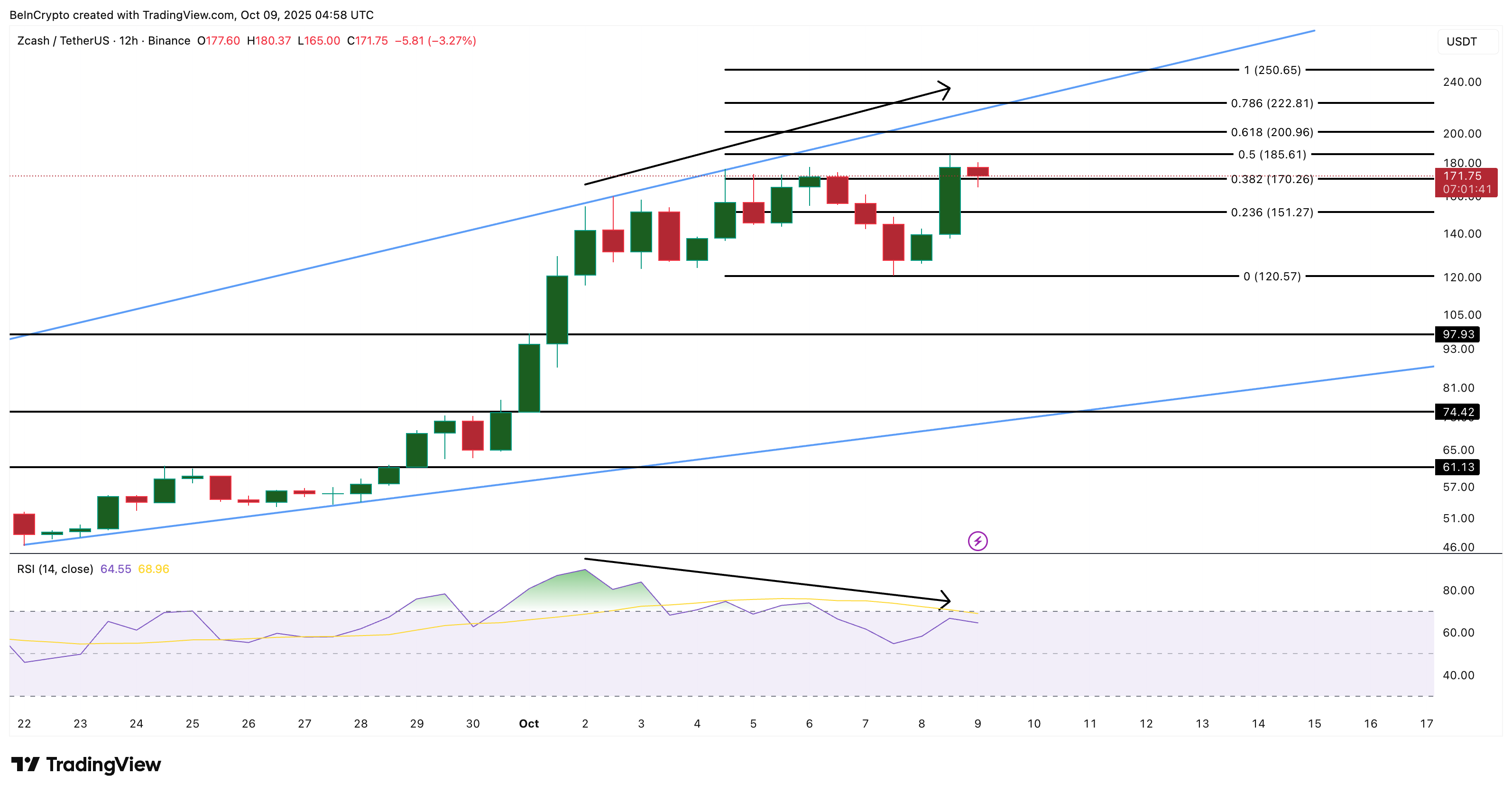 12 saatlik Zcash fiyat grafiği, boğa tuzağı tezini güçlendiriyor. Token, genellikle momentum azaldığında aşağı yönlü kırılan yükselen bir kama yapısının üst trend çizgisine yakın işlem görüyor. 2 Ekim ile 8 Ekim arasında, Zcash fiyatı daha yüksek zirveler yaparken, alım momentumunu ölçen Göreceli Güç Endeksi (RSI) daha düşük zirveler yaptı.