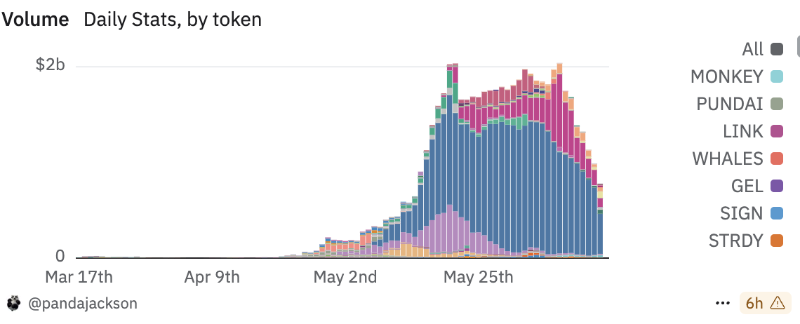 Ai Yi ayrıca, bu ani çöküşün zamanlamasının, birkaç gün boyunca Binance Alpha işlem hacmindeki ardışık düşüşle bağlantılı olabileceğine inanıyor. Dune’dan alınan veriler de haziran başından bu yana bir düşüş trendi gösteriyor. Özellikle, ani çöküşten sonra Binance Alpha’daki işlem hacmi yaklaşık 770 milyon Dolar’a düştü. Bu, 8 Haziran’da yaklaşık 2 milyar Dolar olan zirvenin oldukça altında.
